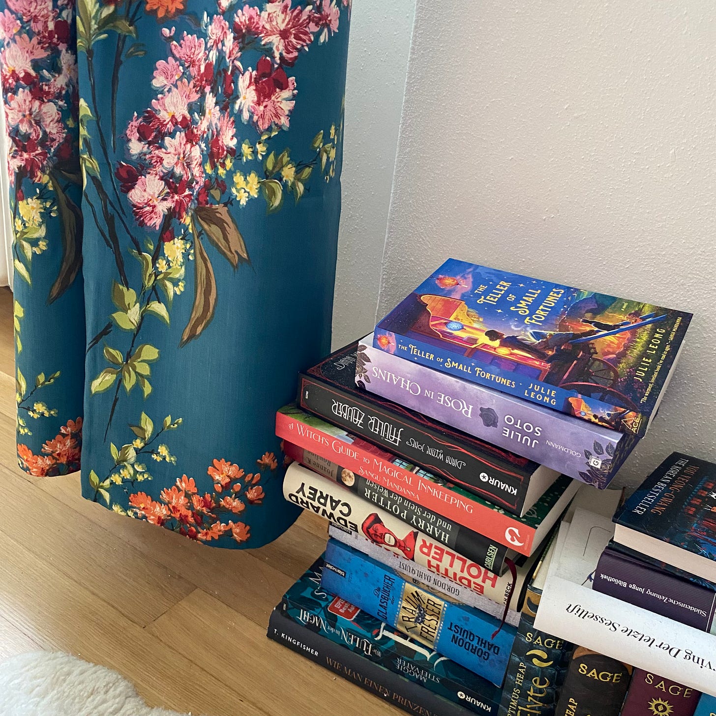 Für viele ist der Sommer ja die Lesezeit schlechthin, doch müssen an dieser Stelle all jene, die auf einen neuen Beitrag aus der Rubrik Salon literarischer Skurrilitäten gehofft haben, auf eine zukünftige Postwurfsendung vertröstet werden. Die Kaps war leider im August vornehmlich damit befasst, Bücher zwar anzulesen, sie aber nach kurzer Zeit aus diversen Gründen abzubrechen. Darum bleibt hier nur das Symbolbild ungelesener (bzw. abgebrochener und auf erneutes Lesen harrender) Bücher, die ein wunderbares Stillleben mit dem neuesten Vorhang im Hause der Kaps bilden. Wobei der Vorhang so neu nicht ist, sondern aus den Truhen und Schränken der Ahnen stammt, wo er seit den siebziger Jahren friedlich ruhte, ehe er wieder ans Tageslicht gezerrt und an die Stange gehängt wurde.