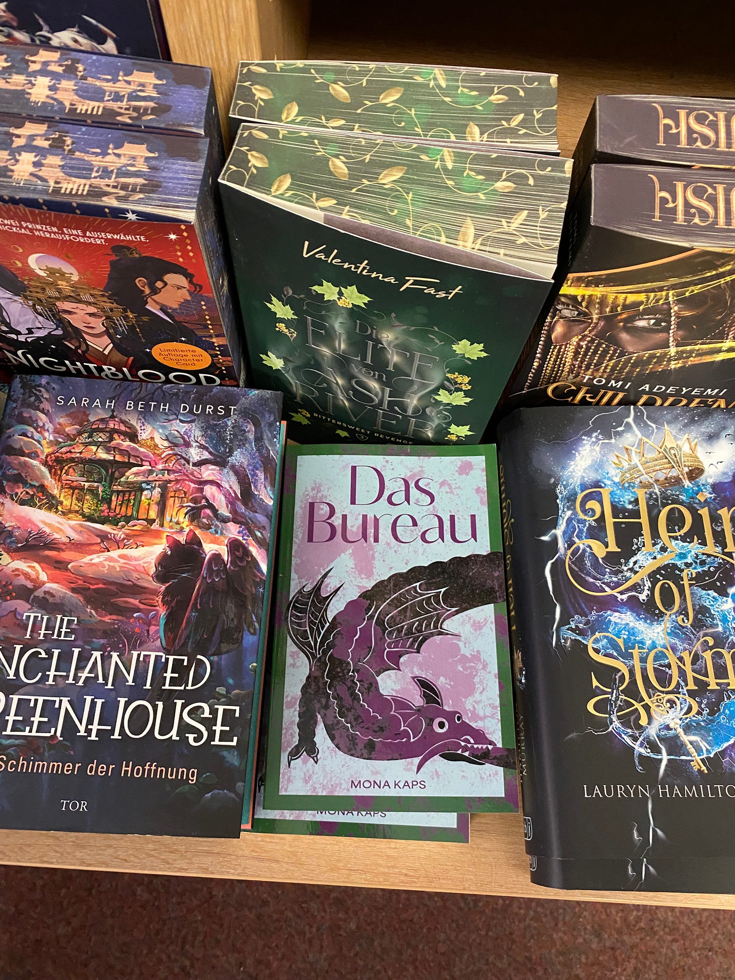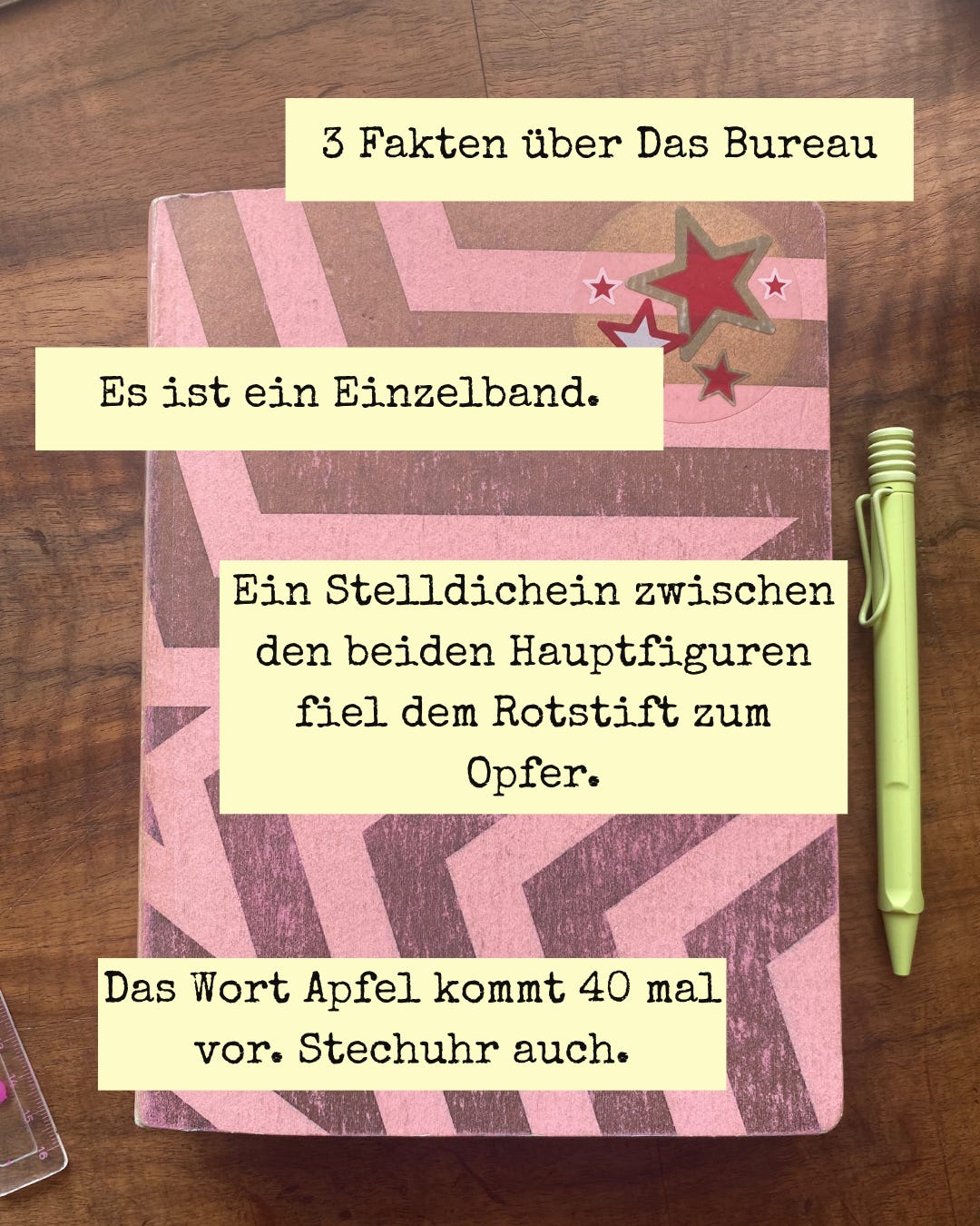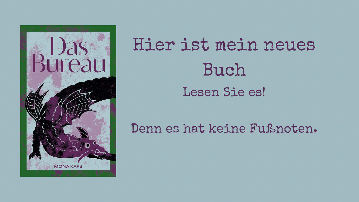 Man mag es kaum glauben, am wenigsten die Kaps, doch seit dem Erscheinen des Bureaus sind auch schon wieder drei Monate vergangen. Was sie ein wenig fassungslos zurücklässt. Mindestens ebenso fassungslos, wenn nicht gar noch fassungsloser ist sie über den Umstand, nun quasi einen Punkt auf der universellen Checkliste aller Schriftsteller abhaken zu können: Ihr Buch ist in der Buchhandlung! Kreisch. Der örtliche Buchhändler, bei dem sie seit gefühlt dreihundert Jahren ihre Einkäufe tätigt, war so nett und hat es ins Sortiment aufgenommen. Wo es nicht allein wegen der Größe oder des fehlenden Farbschnitts aus der Nachbarschaft heraussticht. Das Cover ist schon mega. Das Beweisbild sehen Sie oben.