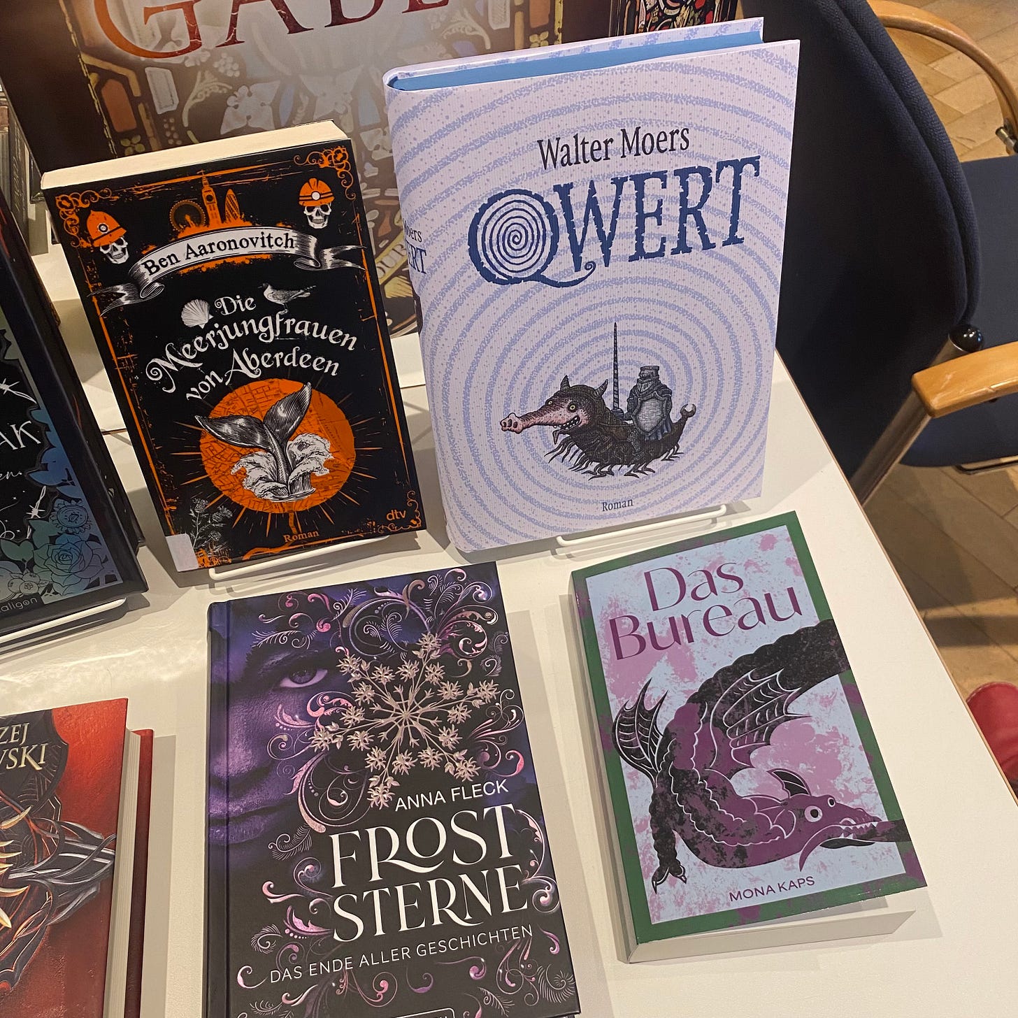 Passend hierzu soll auch der vermutlich letzte Auftritt des Bureaus in freier Wildbahn nicht unter den Tisch fallen. Schließlich lag es bei einer Bücherausstellung in der kleinen Stadt so dekorativ neben bzw. zu Füßen eines literarischen Helden der Kaps. Wobei auch die Nähe zu Aaronovitch nicht zu verachten ist – denn im Unterbewusstsein der Kaps mögen diese Urban Fantasy Krimis beim Schreiben des Bureaus durchaus eine winzige Rolle gespielt haben.