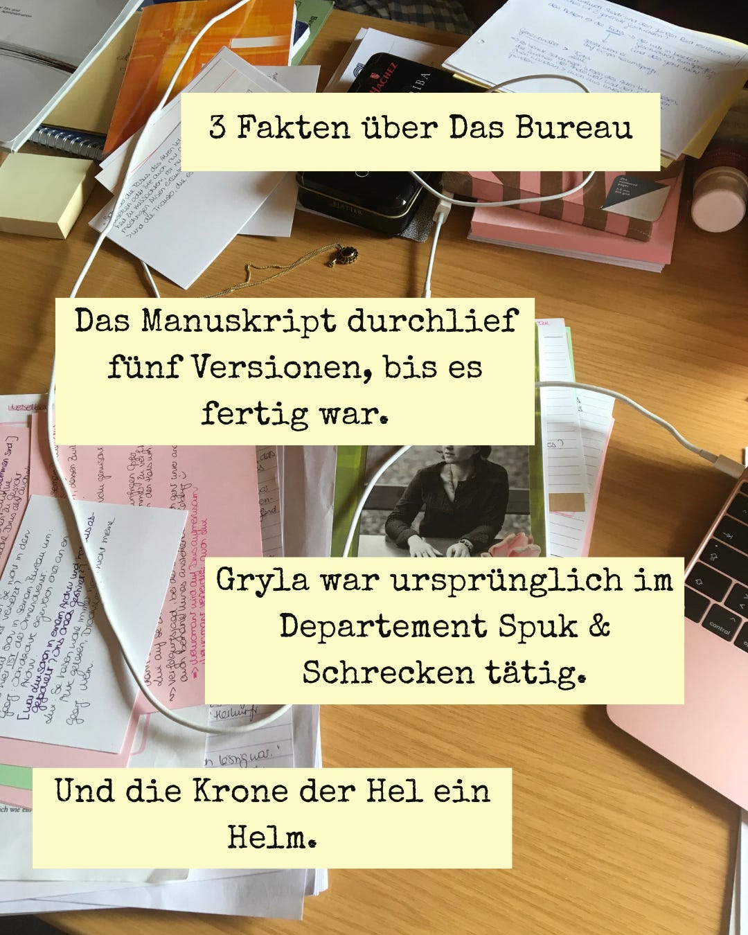 Und überhaupt die Karteikarten. Die Kaps versucht zu Beginn eines jeden Romans mit selbigen zu arbeiten, um sich Plot und Figuren auszudenken. Jedesmal scheitert sie daran kläglich. Den wunderbaren rosegoldenen Rechner unten rechts im Bild benutzt unsere Autorin inzwischen auch nicht mehr oder nur noch sehr selten, da er inzwischen gewisse Verlässlichkeitsdefizite aufweist. Nun aber endlich zu den Fakten: