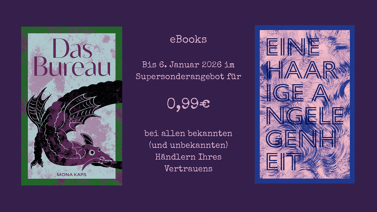 Die Kaps meint es wirklich ernst mit den Depeschen. Wirklich wirklich ernst. Die nächste Postwurfsendung erscheint darum erst im März. Als kleinen Trost gibt es die eBooks Eine haarige Angelegenheit und Das Bureau noch bis 6. Januar 2026 im Supersonderangebot für 0,99 € bei allen bekannten (und unbekannten) Händlern Ihres Vertrauens. Falls Sie den Lukrog bzw. die Katz nicht im Sack kaufen wollen, so finden Sie einige Auszüge in den Miszellen.